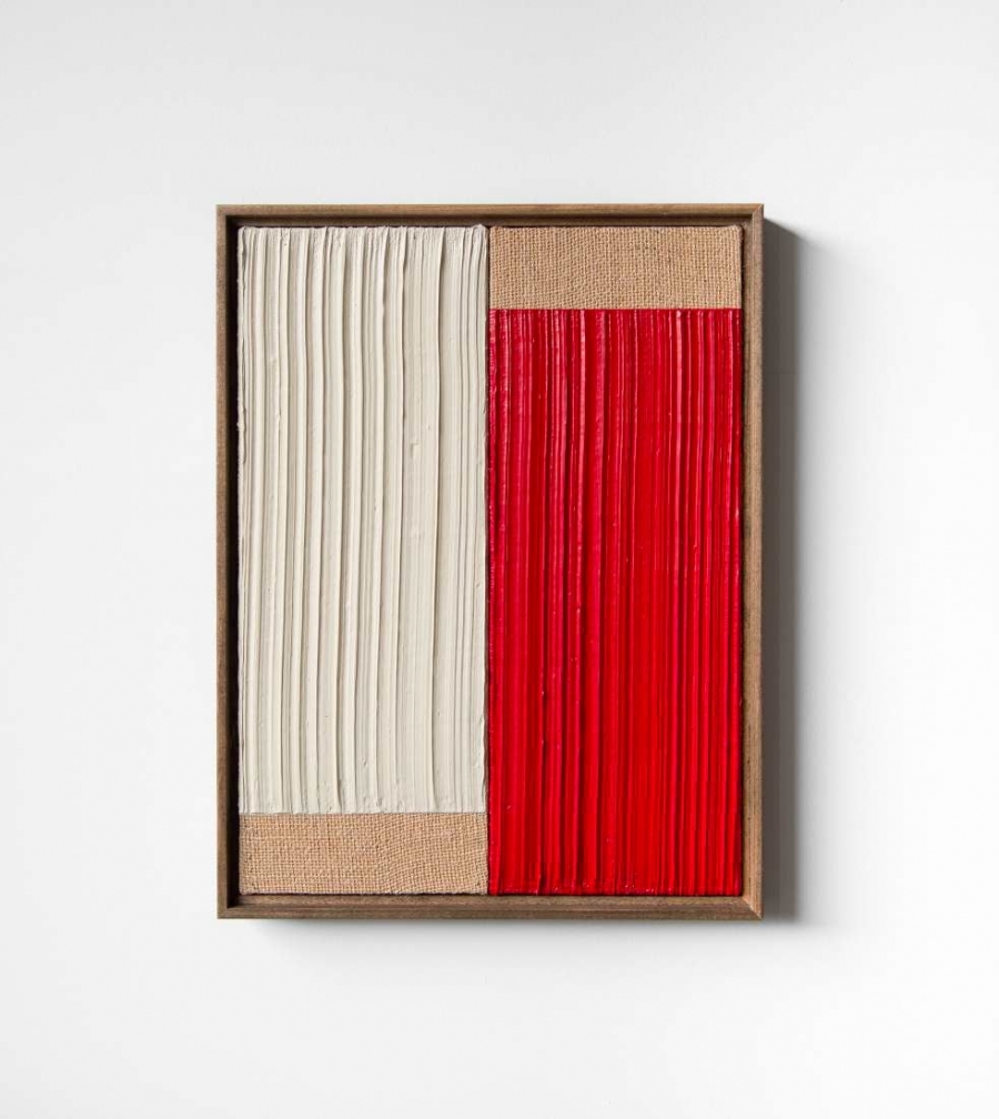 Untitled, White & Red VI 2021 Acrylic and oil on burlap 41 x 31 cm