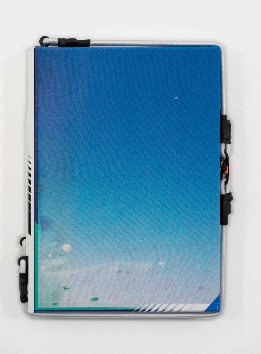 Almost Somewhere 1, 2021 Fabric dye and acrylic on canvas, artist’s frame with shock cords and carabiners 30 x 23 x 3.6 cm