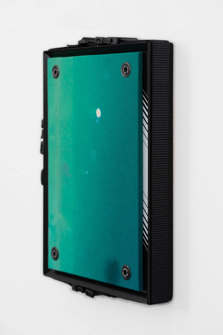 Almost Somewhere 3, 2021 Fabric dye and acrylic on canvas, etched bolts, artist’s frame with custom straps 31 x 23 x 3.6 cm