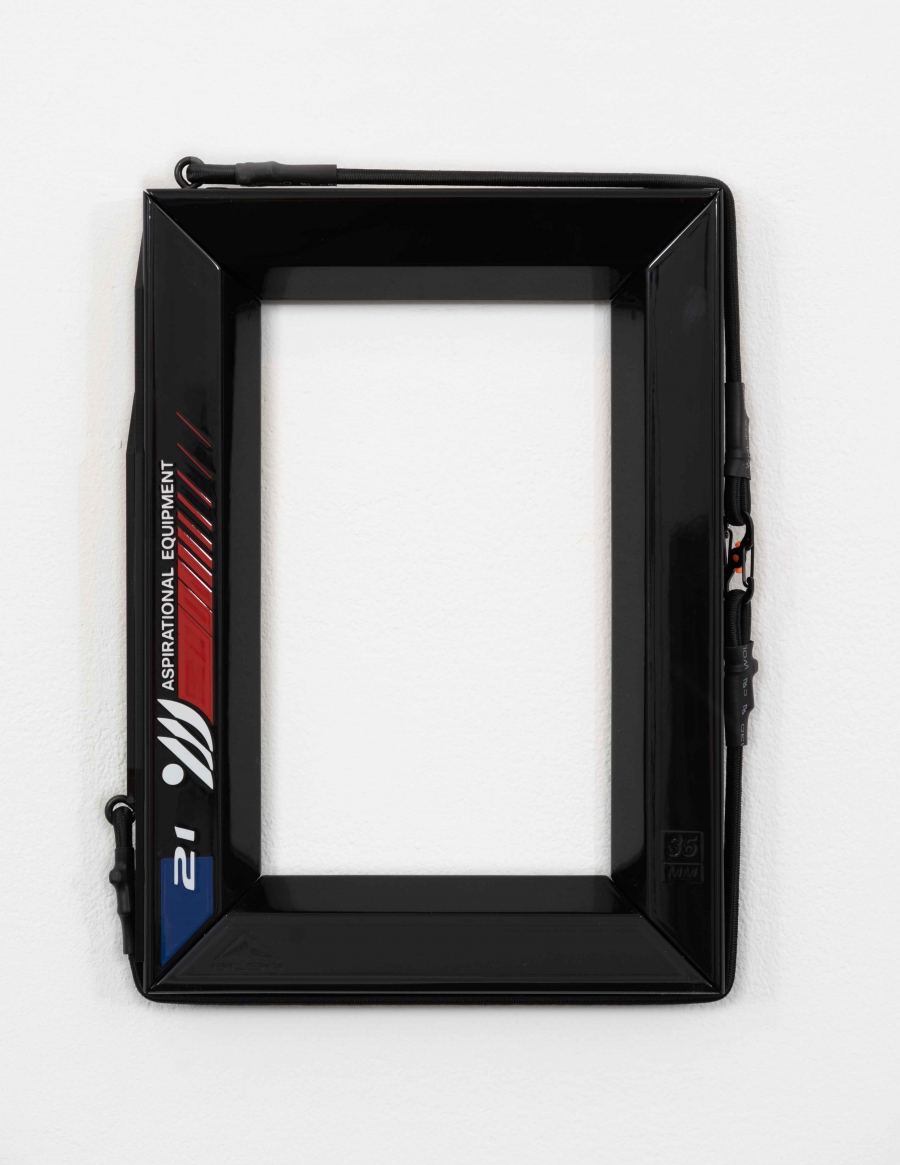 Almost Somewhere 8, 2021 Gloss paint on wood, perspex, shock cords and carabiners 29 x 20.5 x 2.8 cm