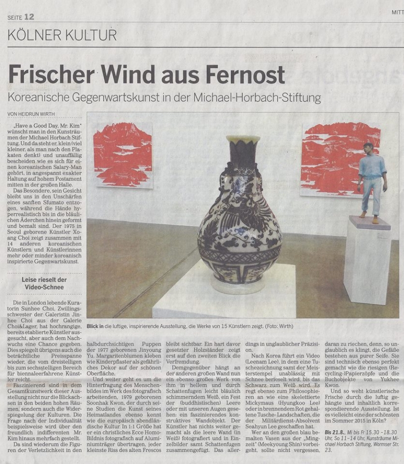 Heidrun Wirth published an article in the German newspaper "Kölnische Rundschau" on July 8th in 2015 about our current exhibition "Have a Good Day, Mr.Kim!". Contemporary Korean Art at the Michael Horbach foundation There he is! (smaller than expected) The Paris-based curator, Sunhee Choi, twin sister of the gallery manager Jinhee Choi, from the Choi&Lager gallery has chosen exclusive and high ranking artist as well as newcomers for this special exhibition. This difference especially become noticeable while looking at the the price list. The show however isn’t only a wild mix of Korean art but fascinates with a strong key note. Every artwork broach the issue of the own identity and individuality. Jinyoung Yu (*1977) for example has created semi-transparent doll-a-like sculptures which are decorated with flowers. It seems like they are plasters which covers the wounds of the fragile bodies. In his photography’s, Soonhak Kwon (*1979) scrutinizes the image of the human being. Using a large Aluminium surface as underground he shows a large photography of a “Ecce homo” fresco. Every crack is noticeable, but the big ladder in the centre of the image doesn’t seem to disturb our peek. Leenam Lee takes us on a trip to a Korea. He presents a video of a traditional bamboo painting, which is slowly covered in snow, during this process the black of the ink becomes white and minor. The exhibition convinced with a dazzling array and maybe is one of the most beautiful this summer in Cologne? µ¿¾ç¿¡¼ ºÒ¾î¿Â ½Å¼±ÇÑ ¹Ù¶÷! ¹ÌÇÏ¿¤ È£¾î¹ÙÈå Àç´ÜÀÇ Çѱ¹ Çö´ë¹Ì¼úÀü½Ã. ±Û¾´ÀÌ: Ä븥 Àϰ£Áö Äë´Ï½¦ ·éµå»þ¿ìÀÇ ÇÏÀÌµÎ·é ºñ¾îÆ® ¹Ú»ç ¹ÌÇÏ¿¤ È£¾î¹ÙÈå Àç´ÜÀÇ ¿¹¼ú°ø°£¿¡¼´Â „ÁÁÀº ÇÏ·ç µÇ¼¼¿ä! ¹Ì½ºÅÍ ±è!“ ¶ó´Â Àλ簡 µé¸°´Ù. Àü½ÃÀå ¾ÈÀ¸·Î µé¾î¼¸é ³ÐÀº Àü½Ã °ø°£ ÇÑ °¡¿îµ¥¿¡ ±× ¹Ì½ºÅÍ ±è(´ëÇü Æ÷½ºÅÍ¿¡¼ º¸´Ù ÈξÀ ´õ ÀÛÀº ¸ð½ÀÀ¸·Î)ÀÌ Çѱ¹ÀÇ ÀüÇüÀûÀÎ »ø·¯¸®¸ÇµéÀÌ ±×·¸µíÀÌ, ¼Ò¹ÚÇÏ°í °â¼ÕÇÏ°Ô ±×¸®°í ¸Å¿ì ±äÀåµÈ ÀÚ¼¼·Î ³ôÀº Á´ë À§¿¡ ²Æ²ÆÀÌ ¼ ÀÖ´Ù. µ¶Æ¯ÇÑ Á¡Àº ±×ÀÇ ¾ó±¼Àº ¸¶Ä¡ ÇǾî¿À¸£´Â ¿¬±â¿¡ °¡¸° µíÀÌ È帴ÇÏ°Ô Ç¥ÇöµÇ¾îÀÖ´Â ¹Ý¸é, ±×ÀÇ ¼ÕÀº ÆÄ¶õ ÈûÁÙ ÀÚ±¹±îÁö ¸Å¿ì ±Ø»ç½ÇÀûÀ¸·Î ¹¦»çµÇ¾ú´Ù´Â °ÍÀÌ´Ù. 1975³â ¼¿ï¿¡¼ ÅÂ¾î³ ÃÖ¼ö¾Ó ÀÛ°¡¸¦ ºñ·ÔÇÑ 14¸íÀÇ Çѱ¹ÀÛ°¡µéÀº Korean À̶ó´Â µ¥¿¡¼ Å©°í ÀÛ°Ô ¿µ°¨À» ¹ÞÀº Çö´ë¹Ì¼úÀ» ¼±º¸À̰í ÀÖ´Ù. Choi&Lager °¶·¯¸®ÀÇ ÃÖ¼±Èñ(µð·ºÅÍ, ÆÄ¸® °ÅÁÖ ¹× Ȱµ¿), ±×³àÀÇ ½ÖµÕÀÌ ÀÚ¸ÅÀÎ ÃÖÁøÈñ(¸Å´Ï¡ µð·ºÅÍ, µ¶ÀÏ °ÅÁÖ¹× È°µ¿), ±×¸®°í Jari Lager(´ÙÀÌ·ºÅÍ, ·±´ø °ÅÁÖ ¹× Ȱµ¿)´Â ÀÛ°¡·Î½á ÀÌ¹Ì º£´Ï½º ºñ¿£³¯·¹¿¡¼ Çѱ¹°üÀ» ´ëÇ¥ÇÏ´Â µî, ÀÔÁö¸¦ ±»Èù À̸§ ÀÖ´Â Çѱ¹ ÀÛ°¡µéµµ ¼±º¸ÀÌÁö¸¸ ½Ç·ÂÀÖ´Â ÀþÀº ÀÛ°¡µé¿¡°Ôµµ ±âȸ¸¦ Á¦°øÇÑ´Ù. µû¶ó¼ ÀÌ Àü½Ã¿¡¼ ¼±º¸ÀÌ´Â ÀÛǰÀÇ °¡°Ý´ë´Â ¼¼ ÀÚ¸®¿¡¼ ºÎÅÍ ¿©¼¸ ÀÚ¸®¿¡ À̸£±â±îÁö õÂ÷¸¸º°ÀÌ´Ù. ÀÌ Àü½ÃÀÇ ¸ðµç ÀÛǰµé¿¡¼ º¸ÀÌ´Â ¸Å¿ì Èï¹Ì·Î¿î »ç½ÇÀº '½Ã°¢ÀÇ Â÷ÀÌ' ¹× '¹®ÈÀÇ ¹Ý¿µ'ÀÌ´Ù. ¿¹¸¦ µé¾î Çö´ë¸¦ »ì¾Æ°¡´Â ‚°³ÀÎ’¿¡ ´ëÇÑ Áú¹®Àº Ä£ÀýÇÏÁö¸¸ ¹«°ü½ÉÇÑ Mr.KimÀ» ÅëÇØ ¹Ýº¹µÇ°í ÀÖÀ½À» º¸¿©ÁØ´Ù. ÀÌ¿Í °°Àº ¸Æ¶ôÀ¸·Î ¿ì¸®´Â À¯Áø¿µ(1977³â»ý) ÀÛ°¡ÀÇ Åõ¸íÇÑ Á¶°¢ ÀÛǰÀ» ÀÌÇØÇÒ ¼ö ÀÖ´Ù. ¸¶°¡¸®Å¸ ²ÉÀ» µé°í ÀÖÁö¸¸ ¾ó±¼¿¡ ³ »óó¸¦ ¹Ýâ°í·Î µ¤°í ÀÖ´Â ¾î¸° Çü»óµéÀº »óó¸¦ ¾È°í Çö´ë¸¦ »ì¾Æ°¡´Â ‚°³ÀÎ’À» ºñÀ¯ÇÑ´Ù. 1979³â»ýÀ¸·Î ¸ð±¹ÀÇ ¿¹¼ú »Ó ¾Æ´Ï¶ó À¯·´ÀÇ ¹®È¿¡µµ ½ÉÃëÇÏ¿© ¿¬±¸ÇÏ´Â ±Ç¼øÇÐ ÀÛ°¡ÀÇ ÀÛǰ¿¡¼´Â »çÁø¿¹¼úÀ» ¸Åü·Î ²÷ÀÓ¾øÀÌ Àΰ£°ú ¿ìÁÖ¿¡ ´ëÇÑ Ã¶ÇÐÀ» ¿¬±¸ÇÏ´Â ¸ð½ÀÀ» º¼ ¼ö ÀÖ´Ù. ±×ÀÇ ÇÑ ÀÛǰ¿¡¼ ±×´Â ÇÑ ±³È¸ÀÇ ´ëÇü ±âµ¶±³ ¼ºÈ¸¦ 1´ë 1·Î »çÁøÀ» Âï¾î¼ ¾Ë·ç¹Ì´½ ÆÇ¿¡ ¿Å°Ü ³õ¾Ò´Âµ¥ ¿À·¡µÈ ¼ºÈÀÇ ¾ÆÁÖ °¡´À´Ù¶õ ±Õ¿¸¶Àúµµ ±×´ë·Î ¿Å°Ü ³õ¾Æ ÀÛǰ Áß°£¿¡ ¾û¶×ÇÏ°Ô ÂïÇôÀִ ö »ç´Ù¸®¸¸ ¾Æ´Ï¶ó¸é ¸ðµÎµé »çÁøÀÌ ¾Æ´Ñ ½ÇÁ¦ Á¾±³È·Î ¹ÏÀ» °ÍÀÌ´Ù. Á¤È®È÷ ÀÌ »çÁø ÀÛǰÀÇ ¹Ý´ëÆí¿¡´Â ÀÌ ÀÛ°¡ÀÇ ´Ù¸¥ ´ëÇü ÀÛǰÀÌ ¼³Ä¡µÇ¾î Àִµ¥ ³Ê¹«³ª ´ëÁ¶ÀûÀ¸·Î ±×¸²ÀÚ·Î ÀÎÇØ ¾à°£ Ǫ¸¥ ºûÀÌ µµ´Â »õÇϾá ÀÛǰÀ» º¼ ¼ö ÀÖ´Ù. ÀÌ´Â º¸´Â ÀÌ¿¡ µû¶ó ºÒ±³ öÇÐÀÎ '¹«' ÀÇ Ç⿬À¸·Î ÇØ¼®µÇ°Å³ª ´Ü¼øÇϰԴ ¸Å¿ì Àλó±íÀº ´ëÇü ±¸Á¶¹°·Î °¨»óÀÇ ´ë»óÀÌ µÈ´Ù. ÀÛ°¡´Â ¿©±â¼ Àü½Ã°¡ ³»·ÁÁø Èò º®¸éÀ» ÃÔ¿µÇÏ¿© ÀÛǰÀ» Á¶°¢ Á¶°¢ ÀÚ¸¥ ÈÄ º®À¸·Î ºÎÅÍ ÀÏÁ¤ °ø°£À» µÎ°í ¼³Ä¡¸¦ ÇÏ¿© ±×¸²ÀÚ¸¦ Çü¼ºÇÏ°Ô ÇÏ´Â ¸Å¿ì ¼¼¹ÐÇÑ ¼³Ä¡¸¦ ¼±º¸ÀδÙ. ÀÌÀ̳² ÀÛ°¡ÀÇ ºñµð¿À¿¡¼´Â µ¿¾çÀÇ ¼ö¹¬È¿¡ Á¡Â÷ÀûÀ¸·Î ´«ÀÌ ³»¸®¸é¼ ÇÑ ÄÒÀÇ ÀÛ°¡ÀÇ µµÀå¿¡±îÁö ´«ÀÌ ¼öºÏÈ÷ ½×¿© ȸé Àüü°¡ °ËÀº»ö¿¡¼ºÎÅÍ Èò»