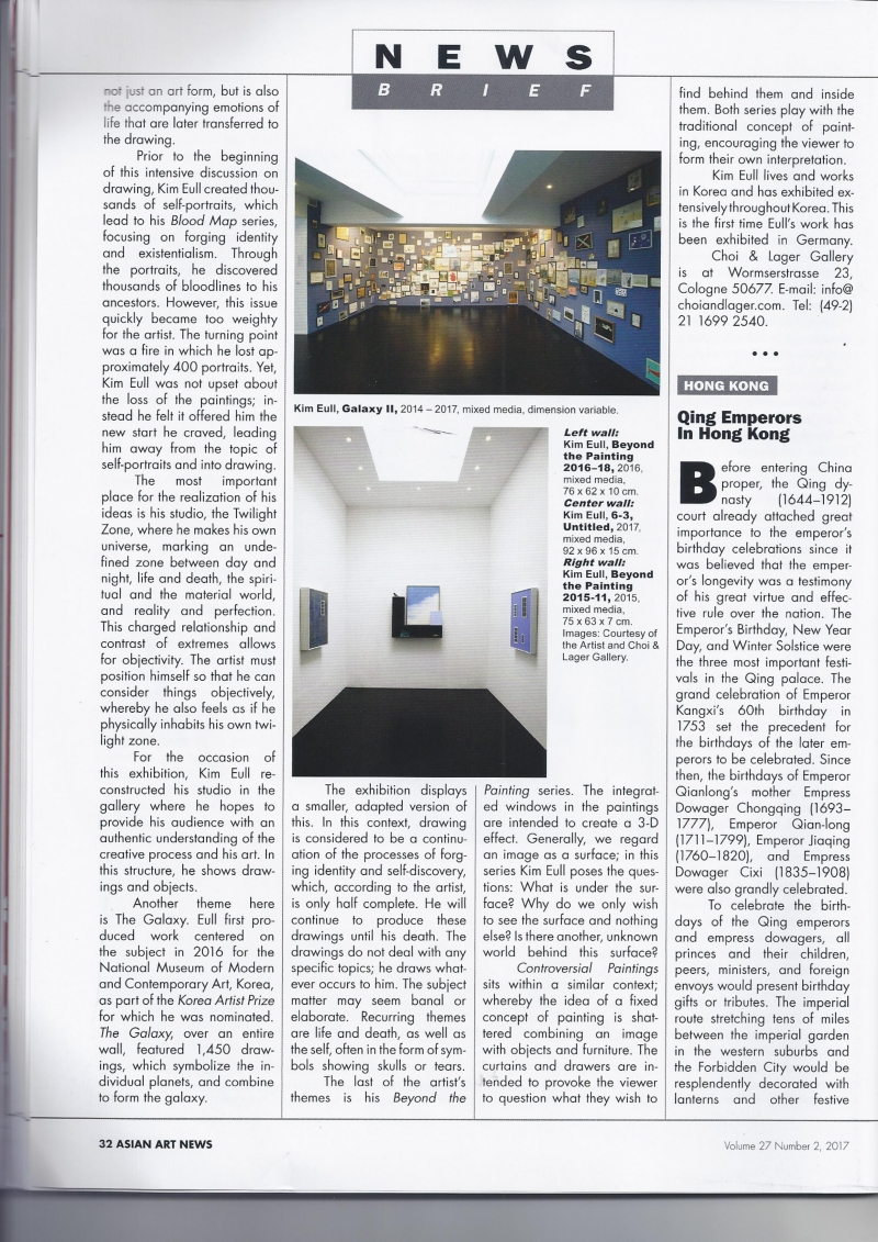 Contrast Of Extremes Choi & Lager Gallery is presenting an exhibition by Korean artist Kim Eull (b.1954), entitled Three Steps to the Left, One Step Forward, through July 30, 2017. The exhibition is centered on drawing transmitted via a variety of media including objects, paintings, and installations, in an attempt to give form to the artist’s deepest thoughts and ideas. For Kim Eull, drawing is not just an art form, but is also the accompanying emotions of life that are later transferred to the drawing. Prior to the beginning of this intensive discussion on drawing, Kim Eull created thousands of self-portraits, which lead to his Blood Map series, focusing on forging identity and existentialism. Through the portraits he discovered thousands of bloodlines to his ancestors. However, this issue quickly became too weighty for the artist. The turning point was a fire in which he lost approximately 400 portraits. Yet, Kim Eull was not upset about the loss of the paintings; instead he felt it offered him the new start he craved, leading him away from the topic of self-portraits and into drawing. The most important place for the realization of his ideas is his studio, the Twilight Zone, where he makes his own universe, marking an undefined zone between day and night, life and death, the spiritual and the material world, and reality and perfection. This charged relationship and contrast of extremes allows for objectivity. The artist must position himself so that he can consider things objectively, whereby he also feels as if he physically inhabits his own twilight zone. For the occasion of this exhibition, Kim Eull reconstructed his studio in the gallery where he hopes to provide his audience with an authentic understanding of the creative process and his art. In this structure, he shows drawings and objects. Another the here is The Galaxy. Eull first produced work centered on the subject in 2016 for the National Museum of Modern and Contemporary Art, Korea, as part of the Korea Artist Prize for which he was nominated. The Galaxy, over an entire wall, featured 1,450 drawings, which symbolize the individual planets, and combine to form the galaxy. The exhibition displays a smaller, adapted version of this. In this context, drawing is considered to be a continuation of the processes of forging identity and self-discovery, which, according to the artist, is only half complete. He will continue to produce these drawings until his death. The drawings do not deal with any specific topics; he draws whatever occurs to him. The subject matter may seem banal or elaborate. Recurring themes are life and death, as well as the self, often in the form of symbols showing skulls or tears. The last of the artist’s themes is his Beyond the Painting series. The integrated windows in the paintings are intended to create a 3-D effect. Generally, we regard an image as a surface; in this series Kim Eull poses the questions: What is under the surface? Why do we only wish to see the surface and nothing else? Is there another, unknown world behind this surface? Controversial Paintings sits within a similar context; whereby the idea of a fixed concept of painting is shattered combining an image with objects and furniture. The curtains and drawers are intended to provoke the viewer to question what they wish to find behind them and inside them. Both series play with the traditional concept of painting, encouraging the viewer to form their own interpretation. Kim Eull lives and works in Korea and has exhibited extensively throughout Korea. This is the first time Eull’s work has been exhibited in Germany. Choi & Lager Gallery is at Wormserstrasse 23, Cologne 50667. E-Mail: info@choiandlager.com. Tel: (49-2) 21 1699 2540.