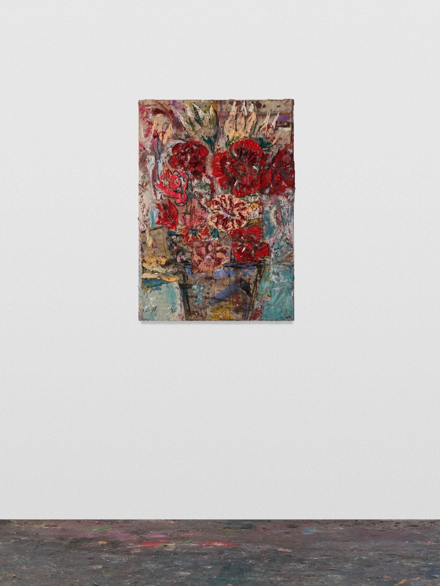 Flowers 14 (red roses), 2021 Oil, acrylic, ink, pastel, charcoal, spray paint, pumice gel and collaged fabrics on canvas 100 x 70 cm